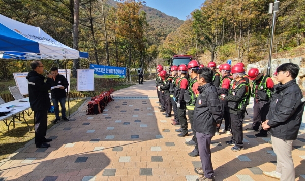 30일 관내 엄사면에 소재한 향적산에서 산불 현장 통합지휘본부 운영 및 산불 진화 기계화시스템 훈련과 기초 진화 훈련을 실시했다(사진=계룡시)
