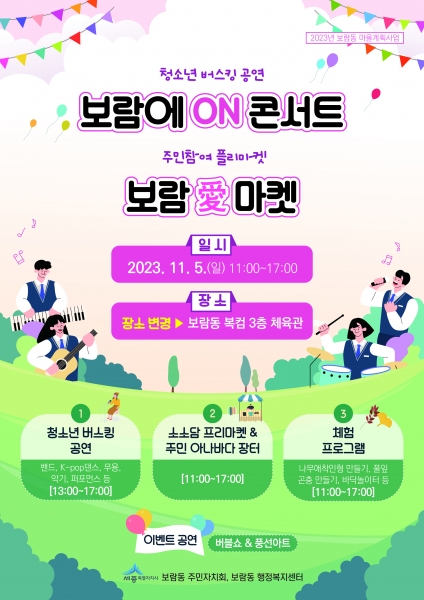 이번 ‘보람에 ON 콘서트’와 ‘보람 愛 마켓’은 보람동 주민들이 직접 계획한 올해 마을계획사업으로 청소년 버스킹 공연과 주민참여 플리마켓을 중심으로 펼쳐진다.