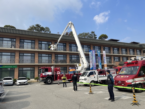 현장은 소방펌프차, 굴절사다리차, 재난안전통신망 등 각종 재난 장비가 투입돼 실전을 방불케 했다.