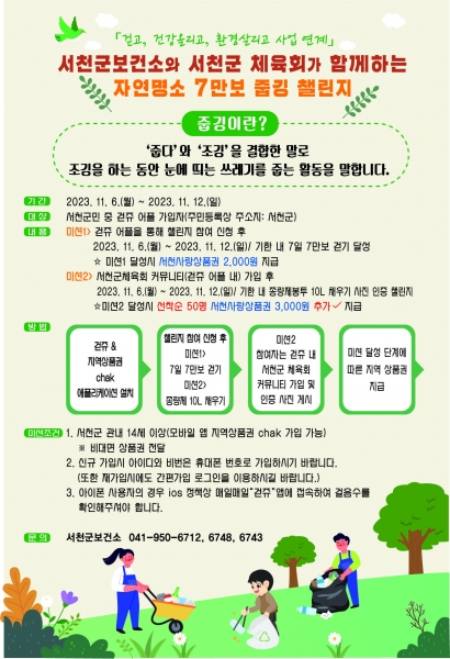 참여자들은 7일간 7만보 걷기 챌린지를 달성하면 서천사랑상품권 2000원을 받을 수 있으며 10L 종량제 봉투를 채우는 환경보호 줍깅 챌린지를 달성한 선착순 50명에게는 추가로 3000원의 지역상품권이 지급된다.