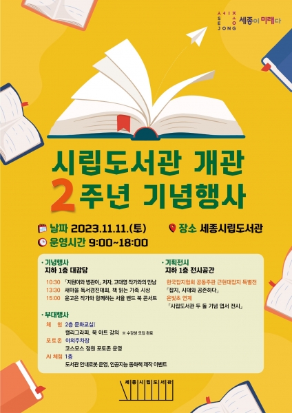 이번 행사는 ‘책 읽는 세종’을 구현하고 다양한 문화행사와 체험 활동이 가능한 복합문화공간으로 활용되고 있는 세종시립도서관의 개관 2주년을 시민과 기념하기 위해 마련됐다.