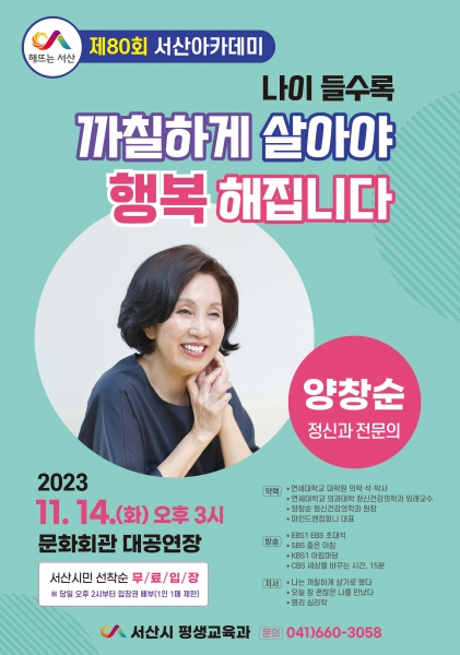 [Ytv영상스토리] 충남 서산시가 14일 오후 3시 문화회관 대공연장에서 양창순 박사를 초청해‘제80회 서산아카데미’를 개최한다고 밝혔다.