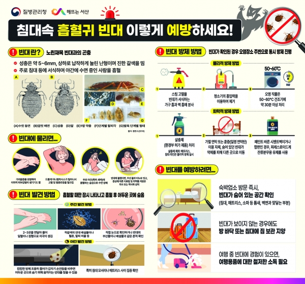 시에 따르면 빈대는 특정 질병을 매개하진 않지만, 인체 흡혈로 수면을 방해하고 가려움증과 이에 따른 이차적 피부 염증을 유발할 수 있어 각별한 주의가 필요하다.