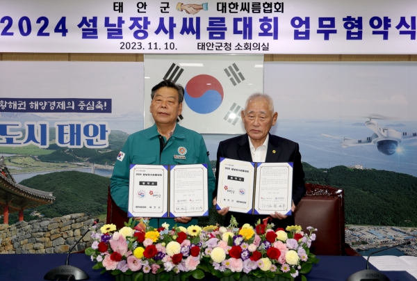 군은 10일 군청 소회의실에서 가세로 군수를 비롯해 대한씨름협회 황경수 회장, 배현선 부회장, 이준희 경기운영본부장, 태안군체육회 최재웅 회장, 태안군씨름협회 가웅현 회장 등 8명이 참석한 가운데 ‘2024 설날장사 씨름대회 협약식’을 갖고 내년 설날장사 씨름대회 태안군 유치를 최종 확정지었다고 밝혔다.