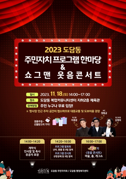 이날 주민자치 프로그램 공연에 이어 오후 4시부터는 KBS 출연 개그맨들로 구성된 ‘쇼그맨’의 웃음콘서트 공연이 펼쳐져 방문객에게 일상 속 피곤을 잊게 해줄 즐거운 공연을 제공할 예정이다.