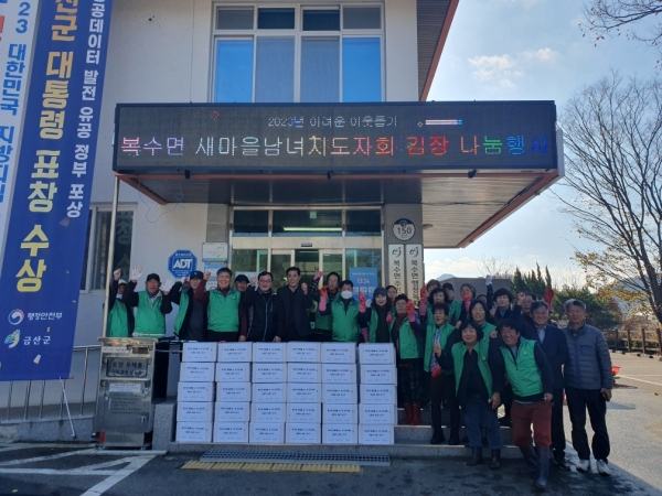 군 관계자는 “어려운 이웃을 위해 사랑의 김장 나눔에 나서주신 읍면 남녀새마을지도자협의회 회원들께 감사드린다”며 “군에서도 따뜻한 온기가 넘치는 마을이 될 수 있도록 최선을 다하겠다”고 말했다.