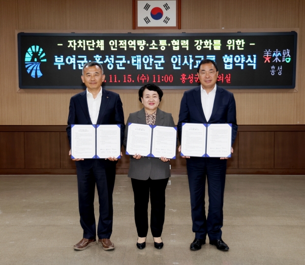 군은 지난 15일 홍성군청 회의실에서 박경찬 부군수를 비롯해 소명수 부여부군수와 조광희 홍성부군수 등 각 지자체 관계자들이 참석한 가운데 ‘태안·홍성·부여 인사교류 협약식’을 갖고 지자체 간 인사교류 활성화를 통한 상생발전에 뜻을 모았다.