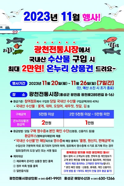 행사는 이번 달 20일부터 26일까지 7일간 광천전통시장에서 진행되며 행사참여점포에서 당일 국내산 수산물을 구입하면 최대 40%까지 온누리상품권으로 환급해주는 방식이다.