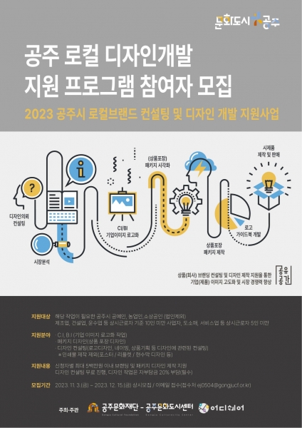 한편 본 사업은 공주 문화도시 조성사업 ‘문화공간 어디쉐어’의 일환으로 진행되며 12월 중 개소 예정인 ‘디자인 공유공간’을 통해 향후에도 시민 대상의 로컬 브랜딩 컨설팅 지원 확대 및 이를 통한 지역 상품 판매촉진을 도모할 예정이다.