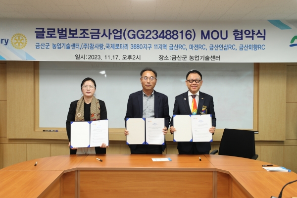 이날 협약을 통해 금산에서 활동하는 금산로타리·마전로타리·금산인삼로타리·금산미향로타리 등 4개 단체가 글로벌 보조금으로 재배시설을 제공하고 ㈜참사랑이 북한이탈주민과 함께 운영하는 북한이탈주민 글로벌그랜트 사업을 추진한다.