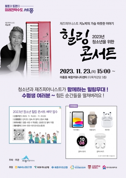 이번 콘서트는 세종특별자치시가 주관하고 NH농협은행·하나은행·세종우리신협·청소년활동진흥센터·고려대·한국영상대가 후원하며 지역 청소년과 수험생 가족들이 무료로 관람할 수 있다.
