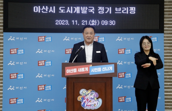 김문수 아산시 도시개발국장은 21일 정기브리핑에서 “아산시는 전국적인 저출산·고령화·저성장으로 인한 인구감소 속에서도 꾸준히 인구가 꾸준히 증가하고 있는 도시”며 “주거 용지 공급 확대, 기반 시설 확충 등 도시경쟁력 강화에 최선을 다하겠다”며 시 도시개발국 주요 사업 추진 현황과 계획을 소개했다.