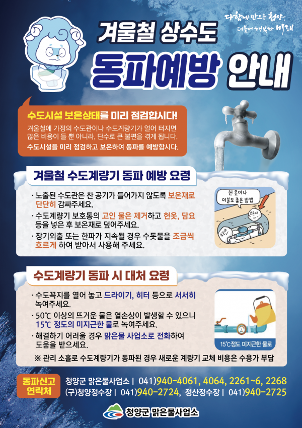 또한, 청양군은 수도시설 동파 예방을 위해 군의 노력과 함께 군민의 적극적인 참여도 매우 중요함을 강조했다.