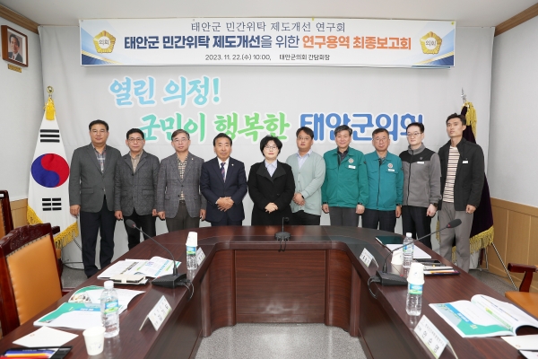 [Ytv영상스토리] 태안군의회 “민간위탁 제도개선 연구회”는 지난 11월 22일 태안군의회 간담회장에서 한국민간위탁경영연구소 및 태안군 관계 공무원들이 참석한 최종보고회를 개최하고 지난 5월부터 시작한 연구용역의 결과를 보고 및 발표하는 자리를 가졌다.