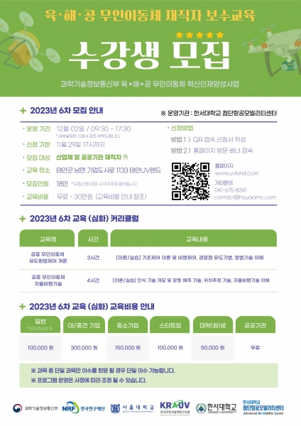한편 ‘육·해·공 무인이동체 보수교육’은 특수목적재직자 보수교육, 기초제작·정비 교육 등 다양한 주제로 올해 6차례 진행됐으며 소방·경찰·육군·취업 희망자 포함 총 75명이 수료하는 등 큰 호응을 얻은 바 있다.