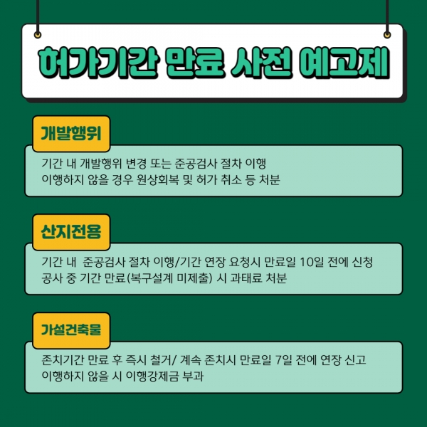 시에 따르면 허가기간 만료 사전예고제는 건축 관련 개발행위 허가기간, 산지전용 허가기간, 가설건축물 존치기간 등이 만료되기 30일 이전에 필요한 행정절차와 만료 사실을 민원인에게 미리 알려주는 제도다.