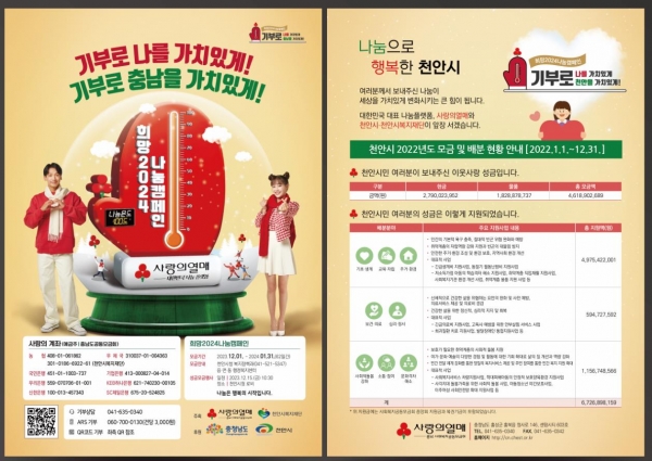 이번 캠페인은 ‘기부로 나를 가치있게, 기부로 천안을 가치있게’를 표어로 이웃에게 희망과 사랑을 전하는 나눔 문화 참여 분위기 조성을 위해 추진된다.