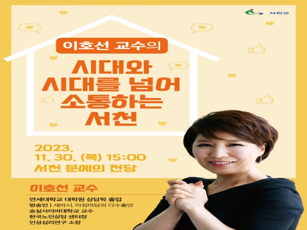 30일에 열리는 강사특강은 숭실사이버대학교 학과장이자 한국노인상담센터 센터장인 이호선 교수를 모시고 ‘시대와 시대를 넘어 소통하는 서천’이라는 주제로 강연이 진행된다.