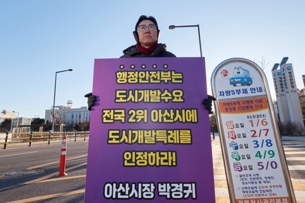이날 1인 피켓시위에 나선 박경귀 시장은 “제도 출범 이후 특례를 부여받은 지자체가 전무한 가운데, 지방자치법 제198조의 ‘실질적 행정수요’ 조건에 그 어떤 시군보다 부합하는 아산시조차 거절된다면 제도의 존재 자체가 흔들릴 수 있다”며 “역으로 아산시가 특례 지정될 경우, 선례가 돼 국정과제인 지방시대를 앞당기는 개척자 역할을 하게 될 것”이라고 강조했다.