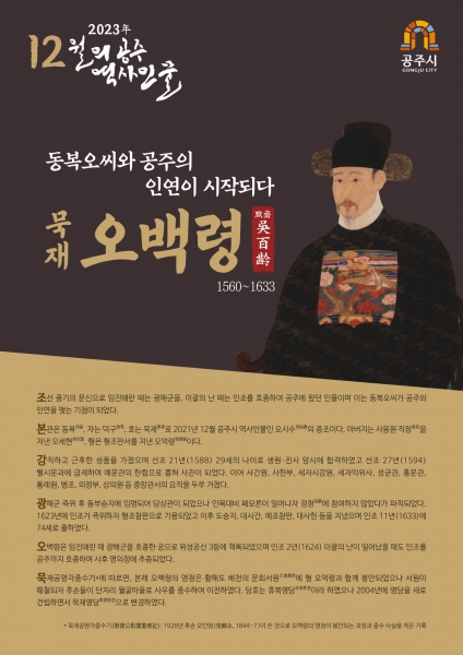 묵재공영각중수기 : 1928년 후손 오인영이 쓴 것으로 오백령의 영정이 봉안되는 과정과 중수사실을 적은 기록조병철 문화재과장은 “조선 중기 광해군과 인조를 호종해 공주와 인연을 맺었던 오백령 선생의 삶을 기리기 위해 12월의 역사인물로 선정했다 12월 중 시민을 대상으로 관련 행사를 개최할 예정”이라고 말했다.