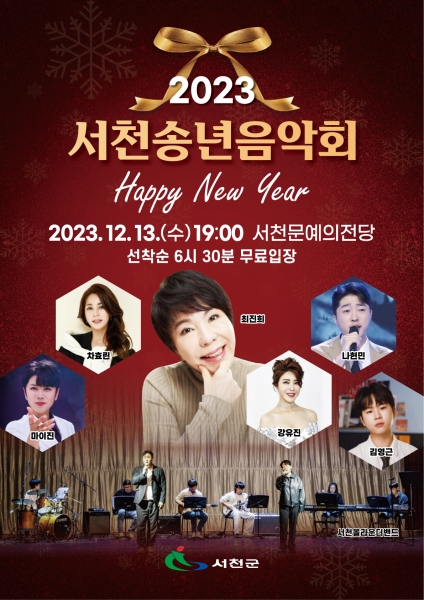 이외에도, 12월 13일 오후 7시 서천 문예의 전당에서 2023년을 마무리하고 다가오는 2024년의 희망의 불씨를 지필 ‘송년음악회’가 열려 최진희, 나현민, 강유진, 마이진, 김영근, 차효린 등의 가수들과 서천군의 청년문화예술단체인 올라운더 밴드가 출연해 한해 동안 수고한 군민들에게 즐거운 시간을 선사할 예정이다.