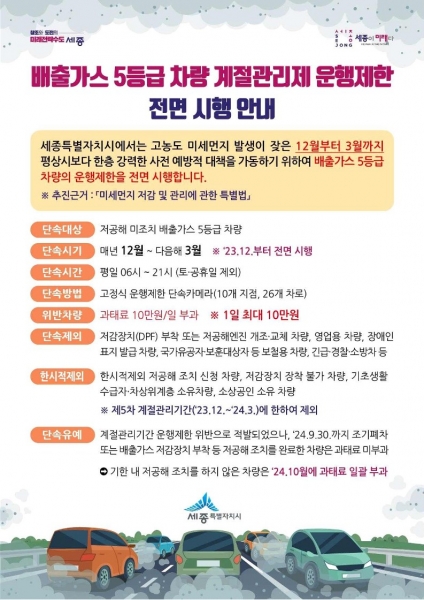 [Ytv영상스토리] 세종특별자치시가 오는 12월 1일부터 내년 3월 31까지 ‘제5차 미세먼지 계절관리제’ 기간 동안 미세먼지 저감을 위해 세종시 전역에서 배출가스 5등급 차량의 운행을 전면 제한한다.