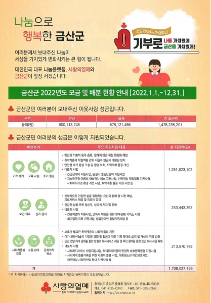 관련 성금은 모금액과 사회복지공동모금회 중앙회지원금 등을 포함한 총 17억1000만원 규모로 공동모금회를 통해 금산군 주민에게 기초·생계, 교육·자립, 주거·환경, 보건·의료, 심리·정서 사회적돌봄 강화, 소통·참여, 문화격차 해소 등 분야에 활용됐다.