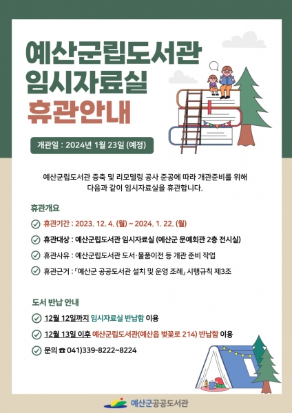 [Ytv영상스토리] 예산군립도서관은 군립도서관 증축 및 리모델링 공사 준공에 따른 재개관 준비를 위해 오는 12월 4일부터 2024년 1월 22일까지 약 7주간 임시자료실을 휴관한다고 밝혔다.