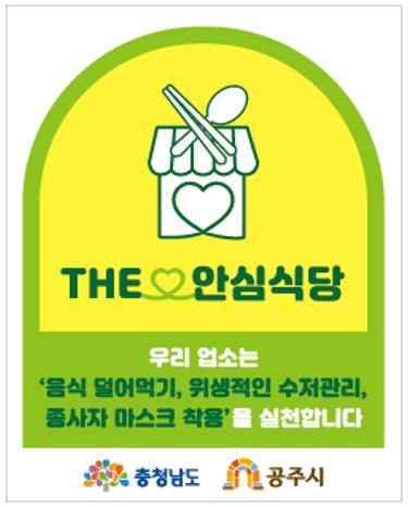 시에 따르면, 안심식당은 감염병에 취약한 식사 문화를 개선하기 위해 덜어 먹는 도구 비치 위생적 수저 관리 종사자 마스크 착용을 실천하는 음식점을 공주시가 지정한 곳이다.
