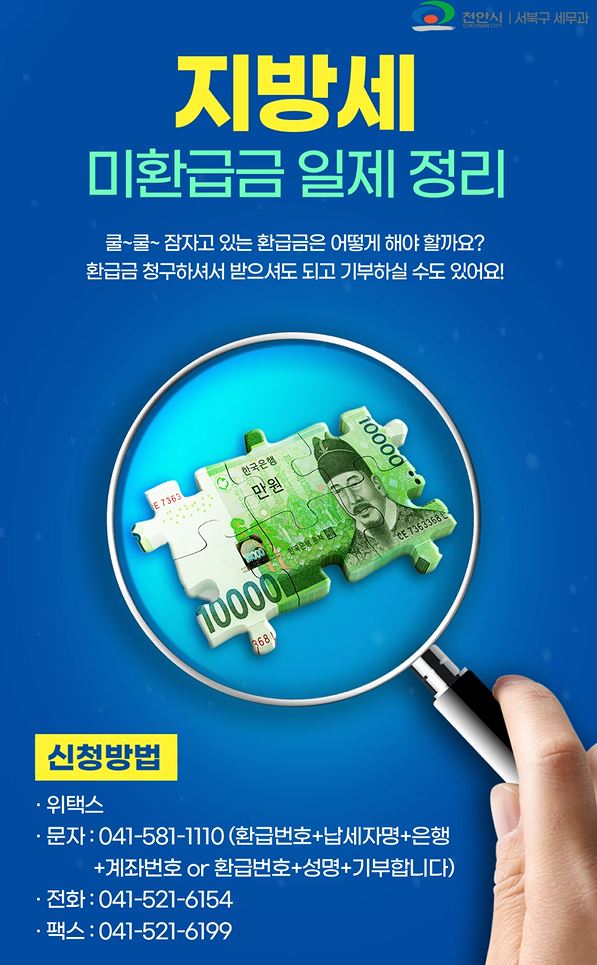 5년안에 수령하지 않을 경우 찾아갈 수 없는 만큼 서북구는 환급통지서를 보내고 천안시 누리집, 아파트 엘리베이터 홍보게시대 등을 이용해 홍보하고 있다.