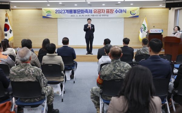 지난 30일 시청 대회의실에서 ‘2023계룡軍문화축제’가 성공적으로 개최될 수 있도록 지원·협조한 유관기관 및 단체, 개인에 대한 표창을 수여했다(사진=계룡시)
