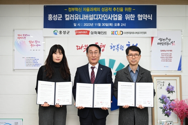 [Ytv영상스토리] 홍성군은 삼화페인트공업, 한국컬러유니버설디자인협회와 정부혁신 자율과제 ‘컬러유니버설디자인사업’의 성공적 추진 및 지속 가능한 발전을 위해 30일 업무협약을 체결했다.