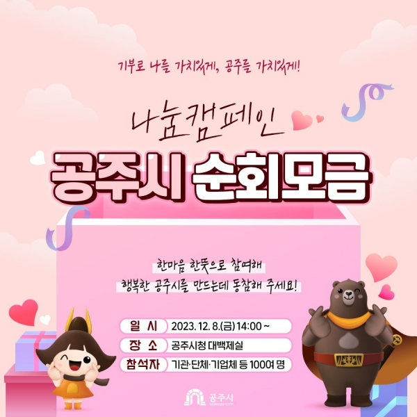 ‘기부로 나를 가치있게, 공주를 가치있게’라는 주제로 진행되는 이번 모금을 통해 시는 전년도 목표액 14억 2600만원 대비 115% 많은 16억 3900만원을 목표액으로 설정했다.