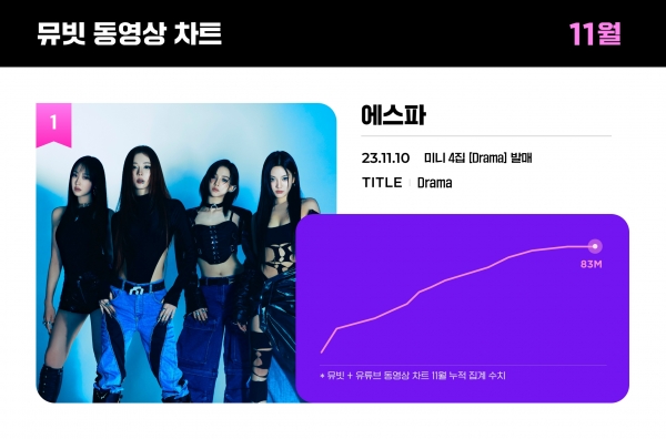 7일 글로벌 팬덤 플랫폼 뮤빗은 “에스파의 ‘Drama’ 뮤직비디오가 11월 최다 조회 수를 기록하며 11월 동영상 차트 1위에 등극했다”고 밝혔다.