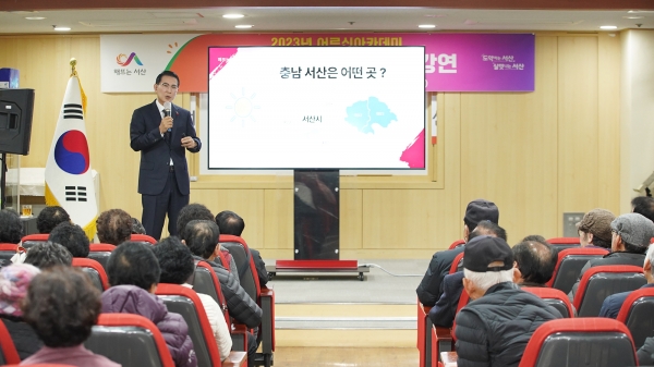 이날 이 시장은 어르신 아카데미 수강생 130여명을 대상으로 서산시 브랜드와 비전을 설명하고 추진 중인 사업과 클레오파트라 행정 등을 설명했다.
