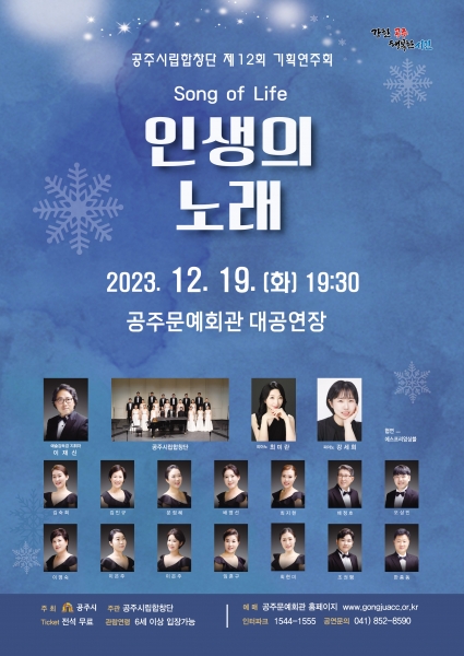 이번 공연은 2024년 공주시립합창단의 창단 10주년을 앞두고 ‘인생의 노래’라는 주제로 ‘인생’, ‘내 맘의 강물’ 등 단원들이 뽑은 인생 최고의 노래를 선곡해 연주한다.