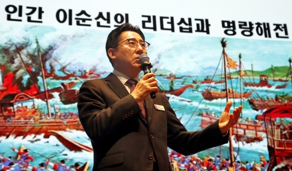 [Ytv영상스토리] 박경귀 아산시장이 지난 12일 시청 시민홀에서 열린 ‘2023 이순신 리더십 아카데미’에서 ‘인간 이순신의 리더십과 명량해전’을 주제로 강연했다.