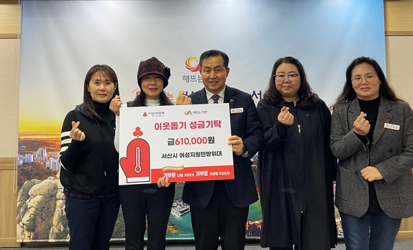 방선아 서산시 여성지원민방위대장은 “연말을 맞아 소외된 이웃들에게 조금이라도 힘이 되고 싶어 대원들과 함께 성금을 모금하게 됐다 작은 성금이지만 어려운 이웃들과 함께할 수 있어서 기쁘다”고 말했다.