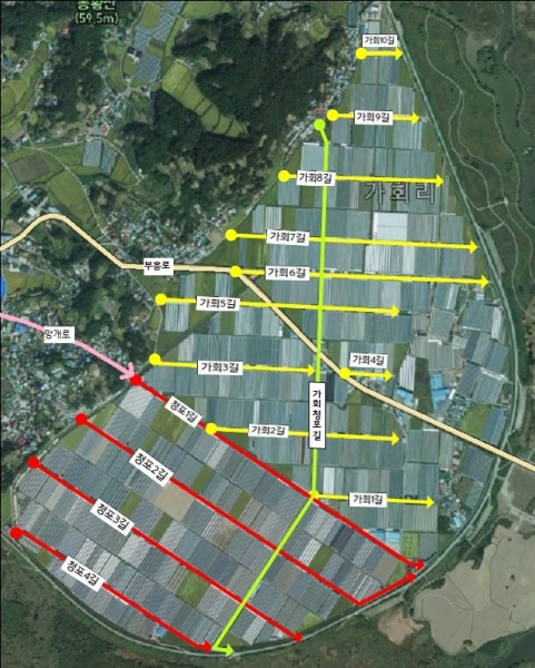 군은 주민의견수렴 및 주소정보위원회 심의 등의 절차를 거쳐 농로 1개 구간 변경, 14개 구간에 신규로 도로명을 부여하고 303농가의 비닐하우스에 도로명주소를 부여했다.
