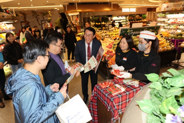 군에 따르면 이용록 군수는 19일 오후 3시 홍콩 시티게이트 아울렛에 위치한 Taste 마켓에서 홍희딸기, 홍성마늘 판촉행사를 개최하며 제철을 맞아 맛과 향이 탁월한 홍희딸기로 홍콩시민들의 입맛을 사로잡았다.