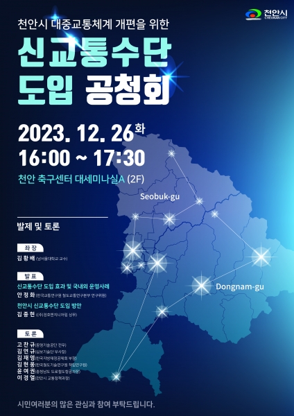 공청회는 ‘신교통수단 도입 효과 및 국내외 운영사례’ 및 ‘천안시 신교통수단 도입 방안’ 등 발표를 중심으로 토론과 질의 답변으로 진행된다.