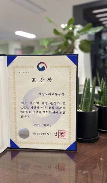 [Ytv영상스토리] 세종도시교통공사는 2023년 자전거 이용 활성화 유공 포상에서 행정안전부 장관 표창을 수상했다고 밝혔다.