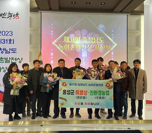 [Ytv영상스토리] 홍성군은 21일 내포 J컨벤션웨딩홀에서 열린 제31회 충청남도 농어촌발전상 시상식에서 주정산 홍동농협조합장이 친환경농업 부문을 수상하고 장곡면 젊은협업농장 정민철 대표가 특별상을 수상하며 2개 부문을 동시에 수상하는 쾌거를 이루었다고 밝혔다.