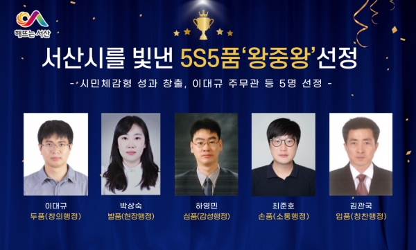 시는 분기별 5S5품왕 27명을 대상으로 직원 다면평가와 공적심사위원회 평가를 거쳐 이대규 주무관 등 5명을 5S5품‘왕중왕’으로 최종 선정했다.