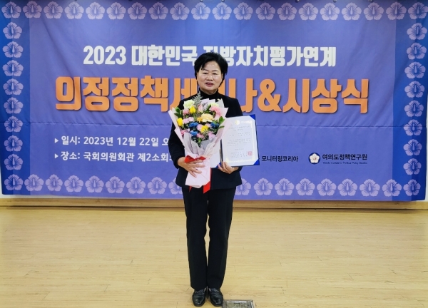 전국 지방자치평가는 의정평가 전문기관인 여의도정책연구원에서 지방의원의 효율적 의정활동 및 지방자치제도 발전에 기여한 실적을 종합 심사해 수상 대상자를 결정한다.