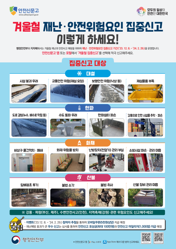 집중신고 대상 분야는 대설, 한파, 화재, 산불로 시민 누구나 안전신문고앱이나 포털에서 신고할 수 있다.