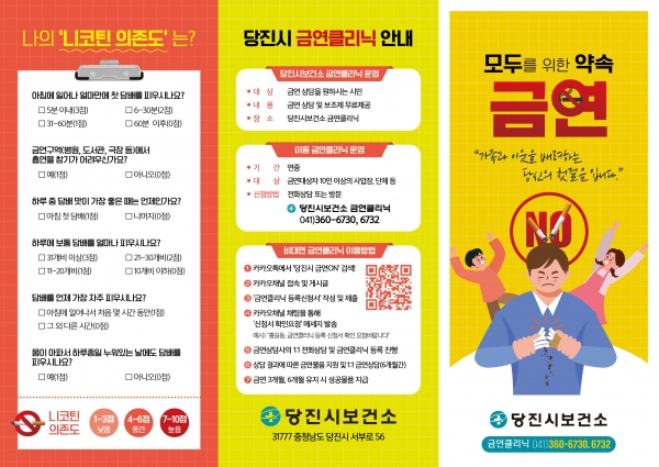 금연 클리닉과 관련한 자세한 사항은 당진시보건소 건강증진과 방문건강팀으로 문의하시거나 카카오톡 채널 ‘당진시 금연온’을 이용해 안내받을 수 있다.
