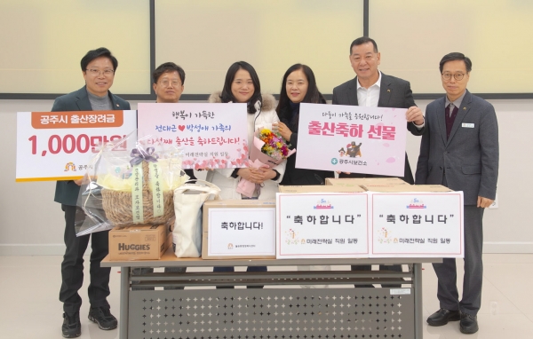 또한 공주시보건소에서는 모자보건사업의 일환으로 속싸개, 손수건 등 육아용품을 전달했으며 인구정책 업무를 담당하는 미래전략실에서는 직원들이 뜻을 모아 기저귀 등을 선물하며 축하의 의미를 더했다.