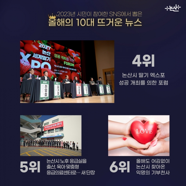 한편 시민 참여 이벤트 ‘2023년 논산시 뜨거운 뉴스 당신의 선택은?’의 결과는 아래와 같다.