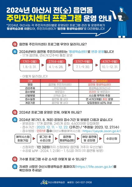 [Ytv영상스토리] 아산시(시장 박경귀)는 올해부터 충남 최초로 읍면동 주민자치센터 프로그램을 흡수·통합해 ‘2024년 읍면동 평생학습센터’를 본격 운영한다고 밝혔다. 그동안 시에서는 읍면동 평생학습센터 7개소를 운영해 왔으며 1월부터 전 읍면동 17개소로 확대 설치·운영한다.